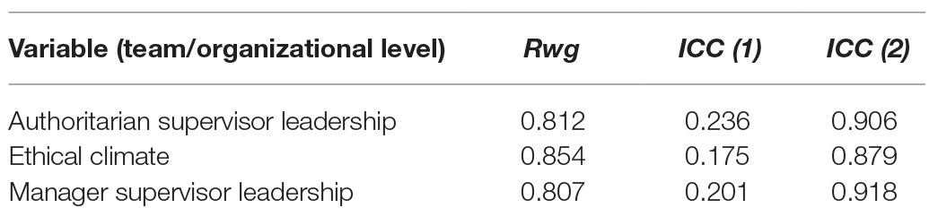 Because the scale pertaining to authoritarian supervisor leadership and the ethical climate was completed by employees and the authoritarian manager leadership and LMX scales were completed by supervisors, it is necessary to test their internal consistency (Rwg) and internal correlation (ICC), to aggregate them at the team or organizational level for testing. The calculated Rwg and ICC values are shown in Table 1, in which we found that the Rwg values met the standard of >0.7; also, the ICC (1) are higher than 0.12 and ICC (2), satisfying the criteria of being above 0.7. Therefore, it is possible to aggregate these values at the team or organizational level.