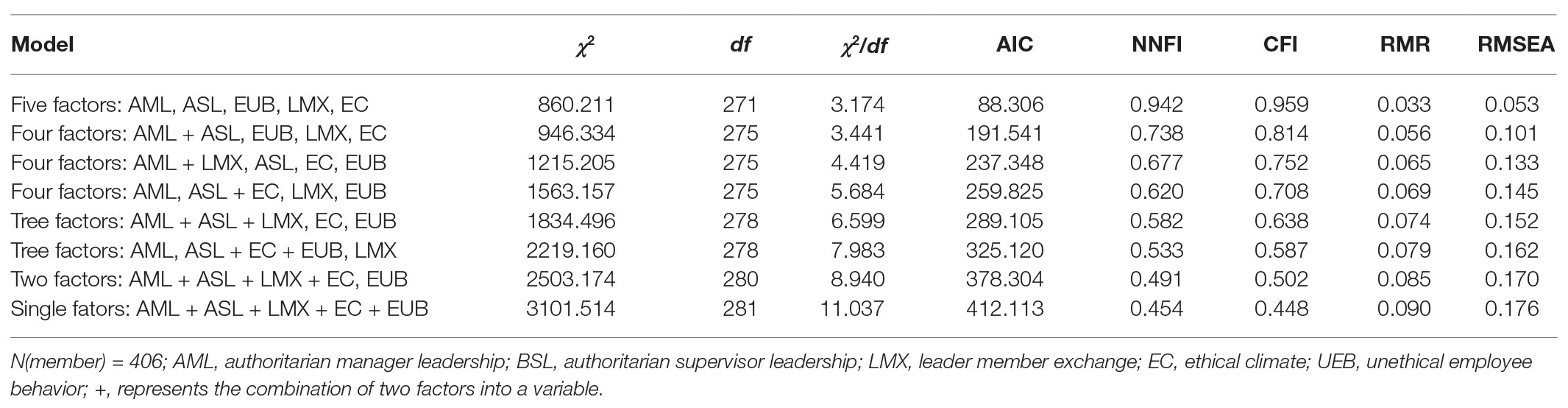 In this study, authoritarian manager leadership, LMX, and unethical employee behavior were evaluated by supervisors, while the authoritarian supervisor leadership and ethical climate were evaluated by employees. Since the questionnaire survey method was mainly adopted, there may also be a common method bias. To test the influence of common method bias, we first used the Harman single-factor test to examine the level of common method bias in this study, such that all the items in the questionnaire are analyzed by factor analysis without rotation. The variation amount of the first principal component explanation is 22.206%, which does not account for half of the total variation explanation amount (68.14%), indicating that the influence of common method bias is not obvious in this study. Considering that the Harman single-factor test is only a relatively rough method, this study also used the controlled, untested, single method latent variable method to test the common method bias that exists in the measurement. The effect of common method bias is included in the aforementioned five-factor model as a latent variable, allowing all the measurement items of the research variables to be loaded on the latent variable of this method and testing the common method bias effect by comparing the fitting degree difference between the two models. The results show that the fitting indexes of the model, including the common method bias latent variables, are also good (χ2/df = 3.261, RMSEA = 0.065, NNFI = 0.925, CFI = 0.976). However, comparing the df and chi-square values of the two models, it is found that the df of the original five-factor model decreases by 5, while the chi-square value of the chi-square model increases by 17.197, which is less than the critical value of 24.700 when the chi-square value was 0.010. Compared with the original five-factor model, the fitting degree of the model incorporating the latent variables of common method bias is not significantly improved, which also indicates that the common method bias in the measurement in this study is to some extent not serious.
