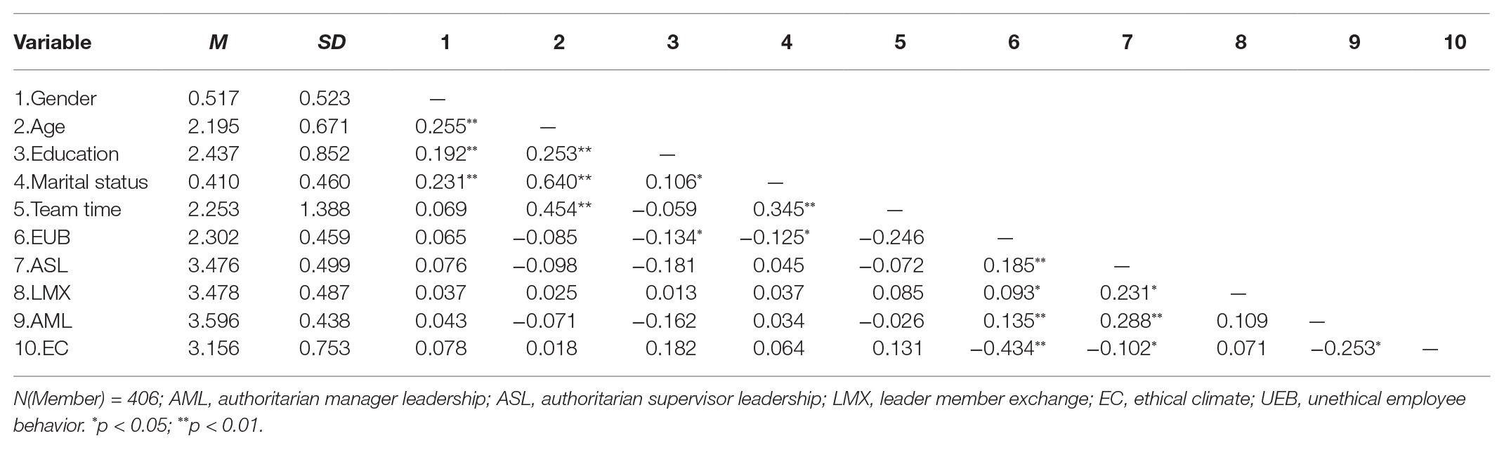 We chose 24 companies in China as samples, including manufacturing, real estate, food processing, and finance, etc. The companies were from Jiangsu, Shanghai, Beijing, Zhejiang, Chongqing, and Wuhan. A total of 95 working teams were chosen as samples, and the respondents were composed of team leaders and other team members. Every team was composed of at least one leader and other members to ensure that sufficient samples were collected. The scale of authoritarian supervisor leadership and the ethical climate was completed by employees, and the scale of authoritarian manager leadership, LMX, and unethical employee behavior was completed by supervisors. From July to October 2016, the author issued questionnaires to supervisors and employees in 24 companies. Before the investigation, we obtained permission and authorization from the person in charge of the company. In addition, with the cooperation of human resources departments, the questionnaire was immediately distributed to respondents. When filling in the questionnaire, the investigators explained the confidentiality of the investigation to the respondents and gave them 100RMB per person. After the questionnaires were completed, the respondents sealed the questionnaires in envelopes and gave them to the researchers. Although 536 questionnaires were distributed, 435 were completed by respondents. Finally, 406 sets of valid questionnaires were obtained from 90 effective teams of 24 enterprises, of which 406 questionnaires were valid. The response rate was 75.7%.