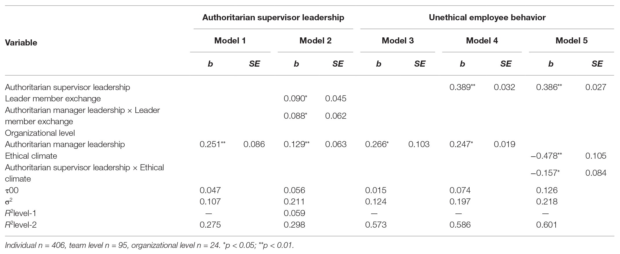 We used Mplus 8.0 to conduct multilevel path analysis, using a nested research design. The variable at level 1 is unethical employee behavior, variables at level 2 are authoritarian supervisor leadership and LMX, while authoritarian manager leadership and ethical climate are at level 2. We first undertook a data aggregation test, and second, performed confirmatory factor analysis, third, we used a common method bias test, and finally, we tested the hypotheses.