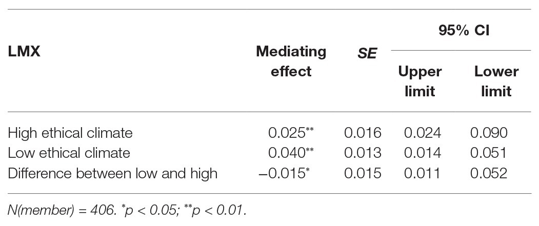 Finally, we again adopted the method suggested by Preacher et al. (2007) to test hypothesis 6, i.e., the moderating effect of ethical climate on the mediating effect of authoritarian supervisor leadership. From Table 6, we can see that in a highly ethical climate (one standard deviation above the mean), the mediating effect of authoritarian supervisor leadership on the relationship between authoritarian manager leadership and unethical employee behavior is 0.025 (SE = 0.016, p < 0.01), and in a low ethical climate (one standard deviation below the mean), the mediating effect of authoritarian supervisor leadership is 0.040 (SE = 0.013, p < 0.01). The former is significantly lower than the latter, and the difference between high and low values is also significant (indirect effect = −0.015, SE = 0.015, p < 0.05). Meanwhile, the 95% CI values are all not zero under high or low ethical climates. Therefore, hypothesis 6 is supported.