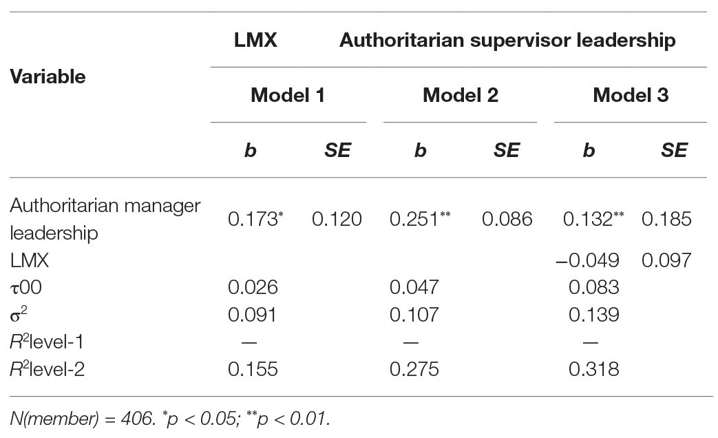 The volume and strength of the evidence presented by Gottfredson and Aguinis (2016) suggest that LMX is commonly a mediator. Therefore, we test whether LMX plays a mediating role in the relationship between authoritarian manager leadership and authoritarian supervisor leadership. As shown in Table 7, in model 1 authoritarian manager leadership is positively related to LMX significantly (γ = 0.173, p < 0.05, 95% CI [0.14, 0.32]), but in model 3, LMX is not related to authoritarian supervisor leadership (γ = −0.049, p > 0.05, 95% CI [−0.18, 0.05]). Therefore, LMX is not the mediator between authoritarian manager leadership and authoritarian supervisor leadership. This means LMX is a more suitable moderator.