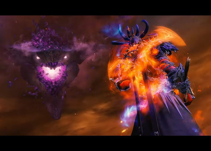 The human god, Balthazar, faces off against the Elder Dragon, Kralkatorrik.