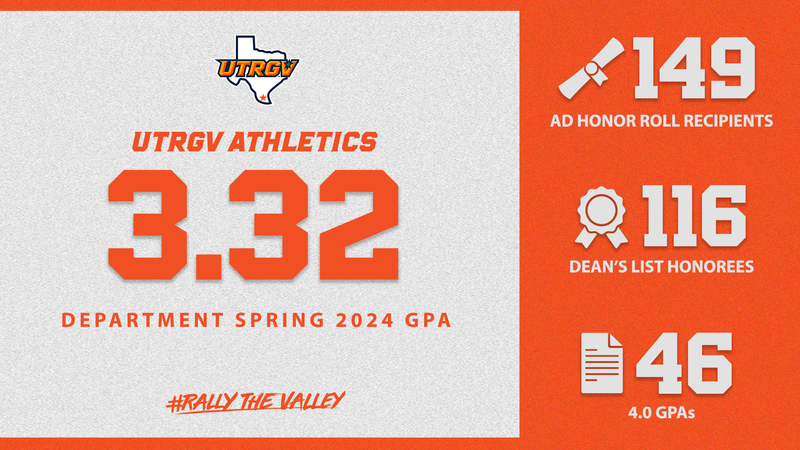 RIO GRANDE VALLEY –The University of Texas Rio Grande Valley (UTRGV) Department of Intercollegiate Athletics announced on Friday that the department’s 232 student-athletes posted a 3.32 grade point average (GPA) with 149 student-athletes earning Athletic Director’s Honor Roll recognition by achieving a grade point average (GPA) of at least 3.25 while serving as full-time students as part of a team during the spring semester.