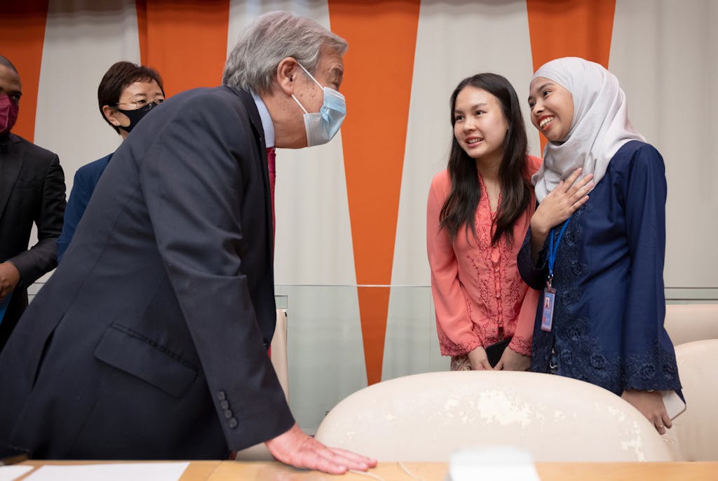 UN Secretary-General António Guterres speaks with Elisa Shafiqah Shahrilnizam (right) and Michelle Lee Xi Fuong before the International Day of Peace youth observance held on the theme “End racism. Build peace.” The event draws attention to the importance of combating racism and building societies in which all people are treated equally.