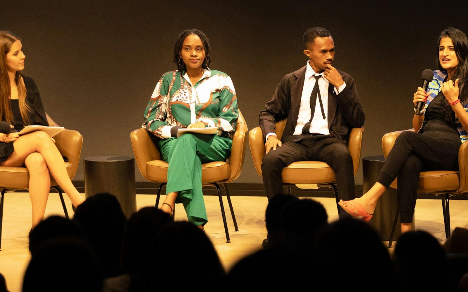 Renata Koch Alvarenga, founder of EmpoderaClima and Fellow at the United Nations; Alice Mukashyaka, co-founder of Starlight and Next Generation Fellow; Gregorius Yoseph Laba, Youth4EIE; and Raakhi Williams, Chief of Strategy and Planning, ECW, during the Let’s Adapt: Education for Climate Justice panel at the Unlock the Future of Learning event.